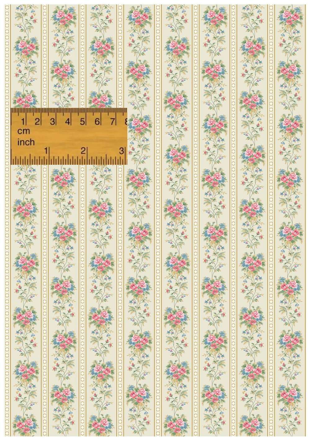 12th Miniature Gold Striped Red Blue Floral Wallpaper Seamless - Digital Printable Instant Download - A4 Printable Sheet for Dollhouses Model Homes School Projects DIY